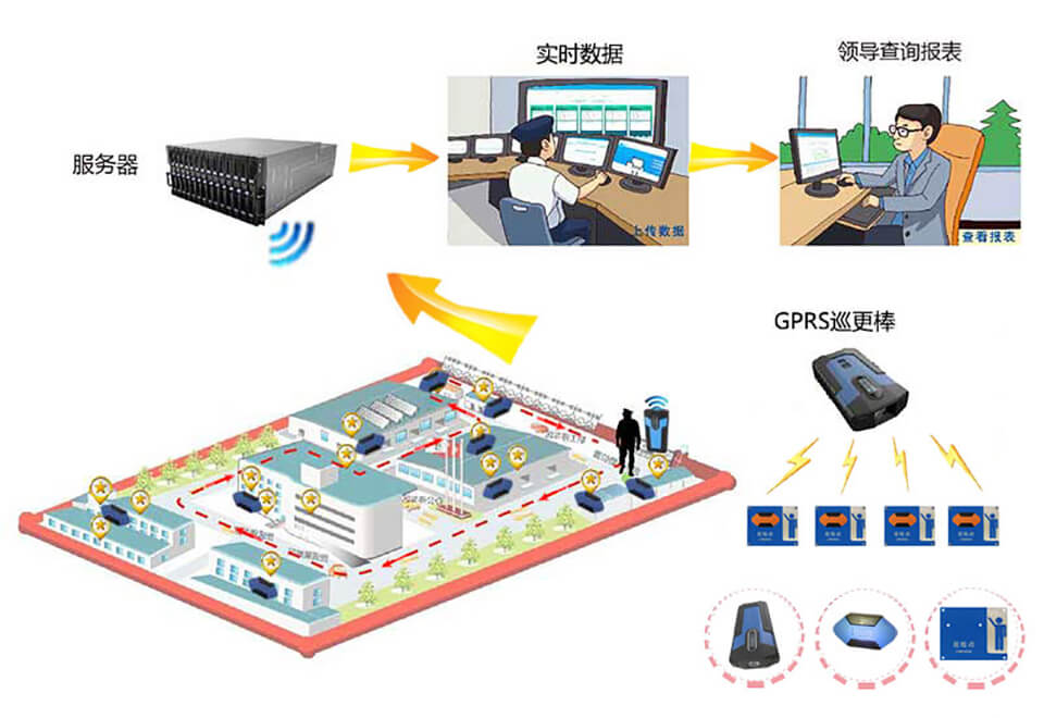 在巡邏過程中,保安人員攜帶感應(yīng)式巡更機,按制定的巡檢計劃到達指定巡檢點,用巡更機掃描讀取巡檢點采集巡邏信息,巡邏的日期時間地點等數(shù)據(jù)就會通過GPRS發(fā)送到管理中心,由后臺系統(tǒng)軟件自動進行處理、分析、統(tǒng)計、制作報表等。