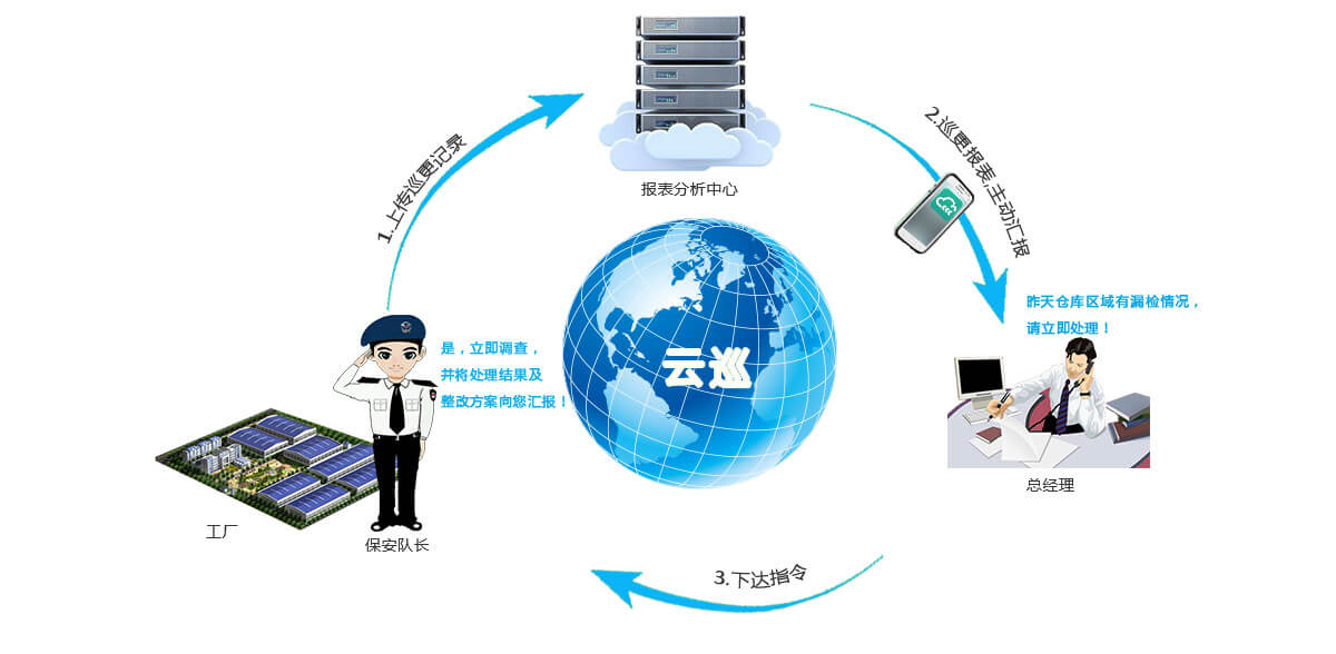 電子巡更巡檢系統(tǒng)發(fā)展至今從最初起的單機版,只能依靠本地PC機,將巡更軟件安裝在上面,將巡更棒中的數(shù)據(jù)下載至PC機軟件中,再通過手動查詢巡更結果報告;隨著互聯(lián)網(wǎng)應用技術的進步,以互聯(lián)網(wǎng)巡更管理系統(tǒng)為基礎平臺的一種全新巡更管理系統(tǒng)出現(xiàn),它就是今天的云巡更“云巡”!