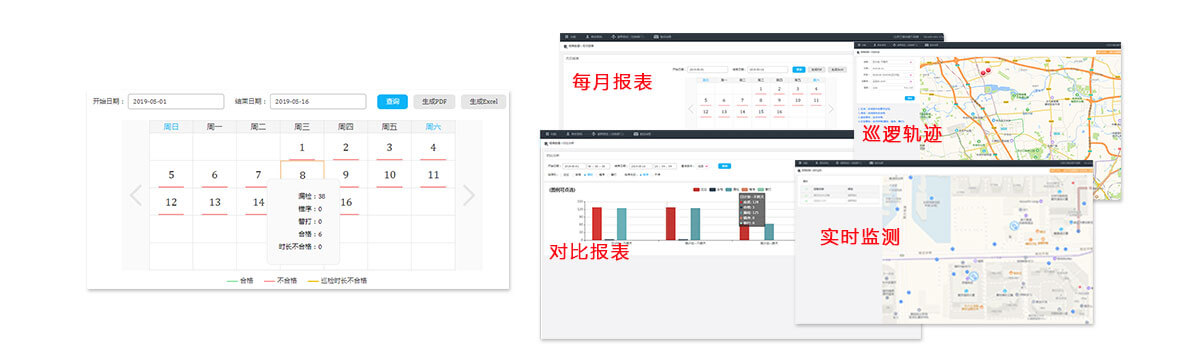 2.一瞥式報表:一周、一月的巡邏情況一望便知,無需翻頁;顏色標識,圖像標注更清晰明了。